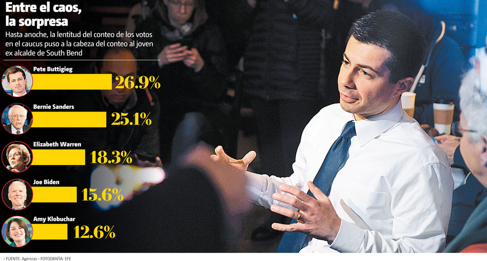 El aspirante demócrata a la Casa Blanca Pete Buttigieg sorprendió ayer al aventajar a Bernie Sanders en las caóticas asambleas ciudadanas de Iowa, en las que el favorito en los sondeos nacionales Joe Biden se hundió, según resultados parciales publicados con embarazoso retraso.