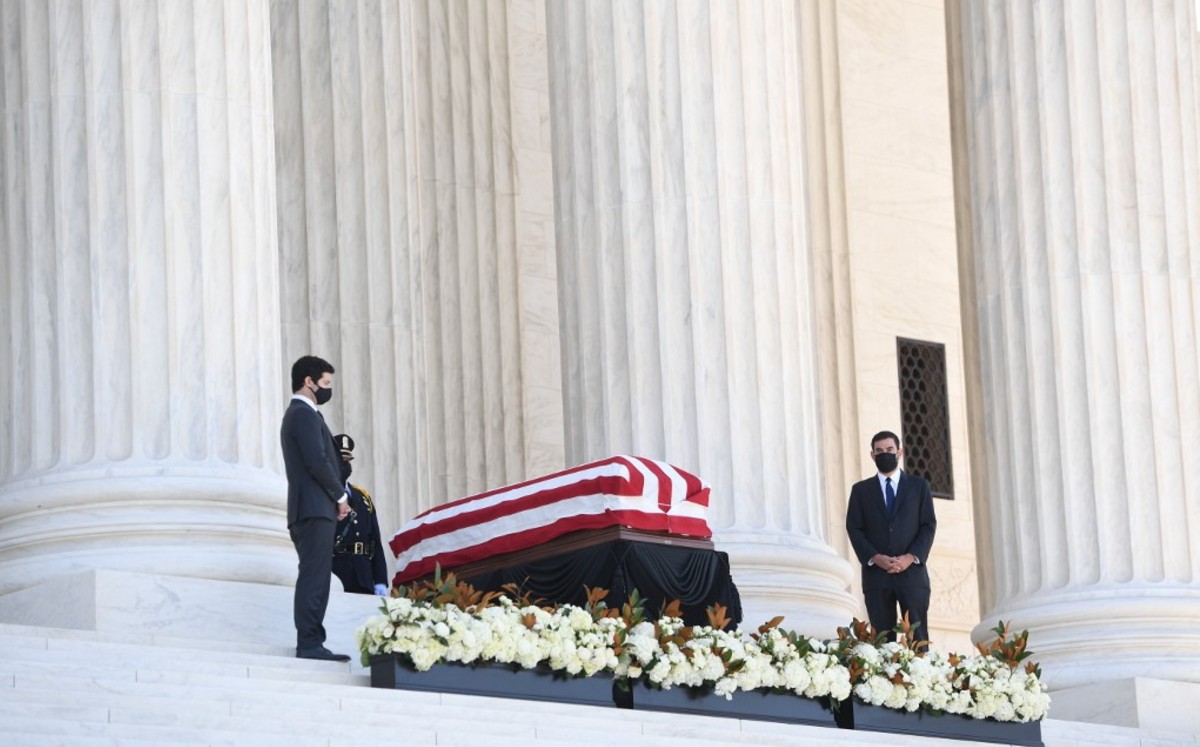 se colocó en la parte superior de los escalones de la entrada de la corte para que el público pueda presentar sus respetos a la segunda mujer en ser ministra del máximo tribunal estadunidense, siguiendo las pautas de salud pública para la pandemia de coronavirus.