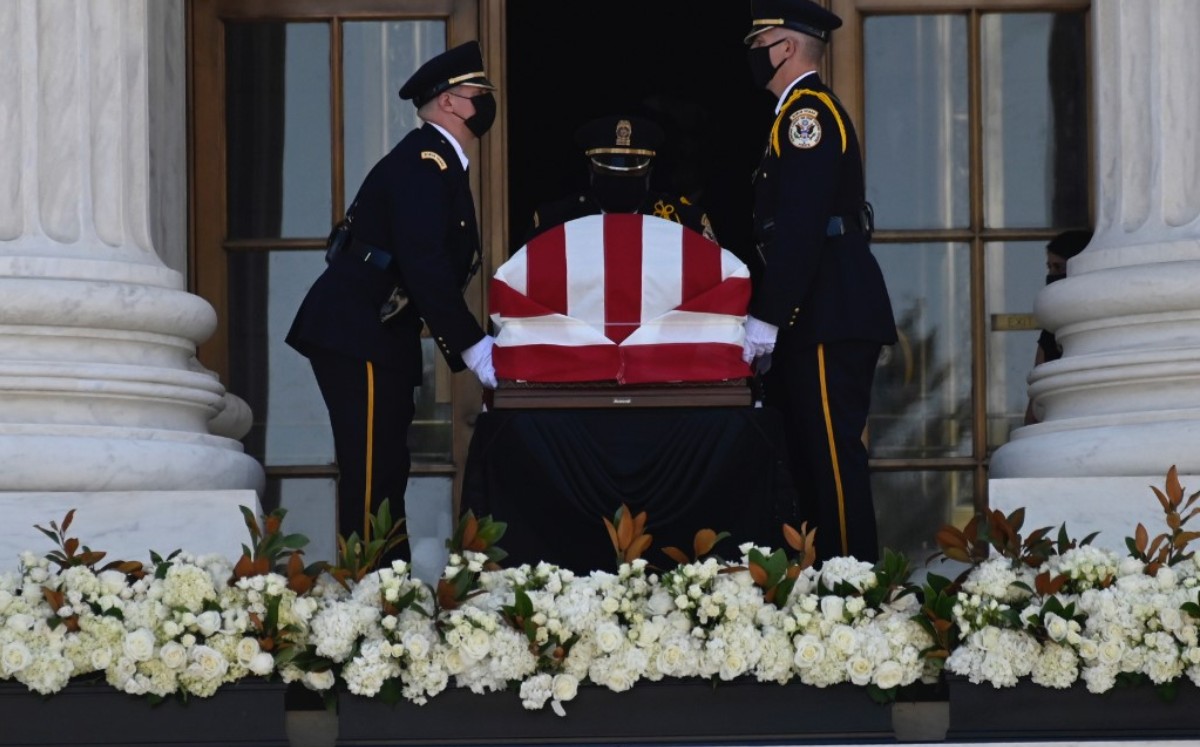 El ataúd de Ginsburg llegó a la corte a las 09:30 horas y fue llevado al Gran Salón de la corte, pasando junto a sus antiguos secretarios legales que se alineaban en los escalones.