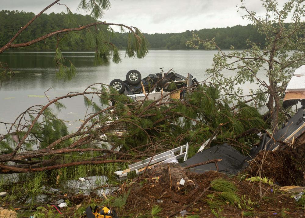 El tornado EF-2 volcó varios vehículos recreativos, arrojando uno de los vehículos volcados a unos 61 metros en un lago, dijo el Servicio Meteorológico Nacional en un informe preliminar la madrugada del jueves después de que sus empleados inspeccionaron los daños.