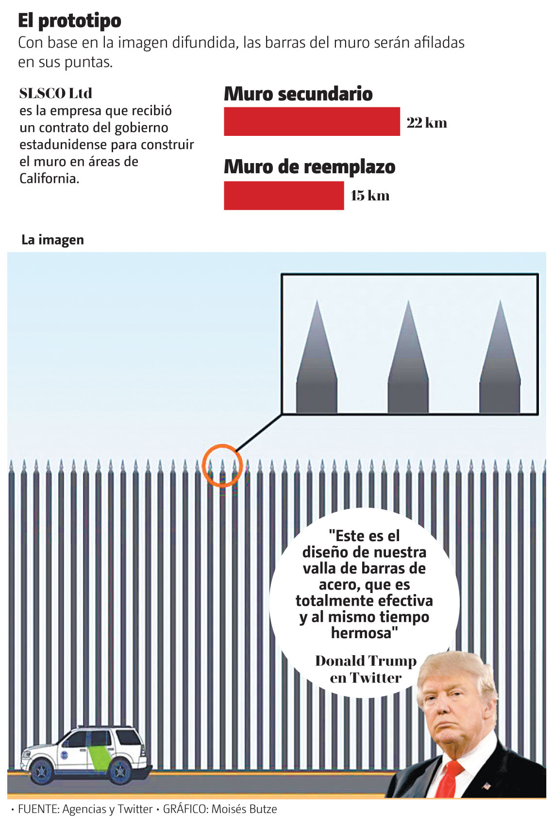 También dio a conocer el diseño de la valla que pretende construir en la frontera sur para garantizar seguridad. “Este es el diseño de nuestra valla de barras de acero, que es totalmente efectiva y al mismo tiempo hermosa", explicó. Adjunto a su publicación una imagen de las barras del muro, de varios metros de altura y afiladas en sus puntas.