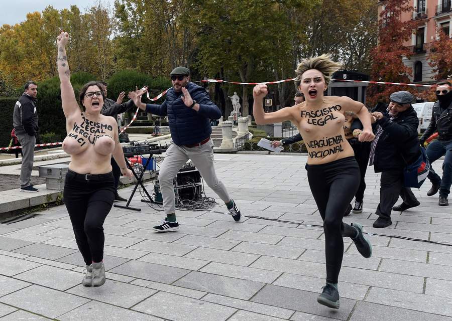 Agentes a caballo y a pie se desplazaron rápidamente para mantener alejadas a los 200 asistentes al acto a los miembros del grupo Femen, que irrumpieron con el pecho desnudo y la leyenda “Fascismo legal, vergüenza nacional” pintada en el torso.