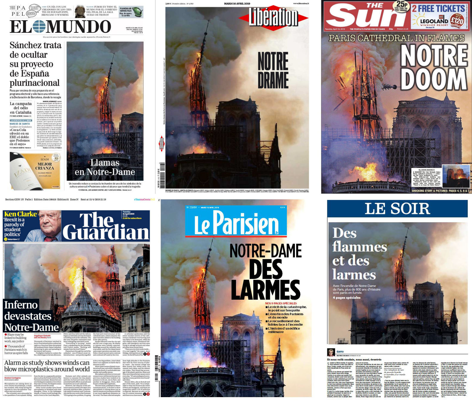 El fuego consumiendo la catedral de París aparece hoy en las portadas de diarios europeos.