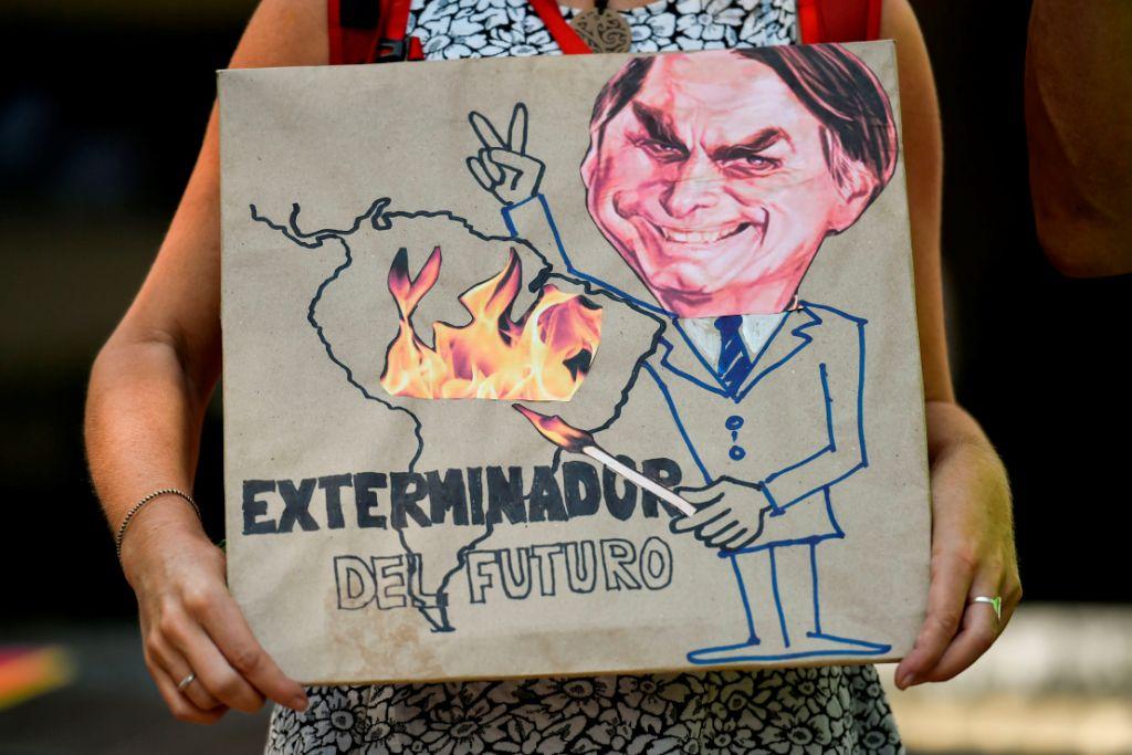 "No es fuego, es capitalismo", denunciaron los cientos de personas reunidas frente al consulado de Brasil en Barcelona, que calificaron a Bolsonaro de "asesino" y "fascista", entre cánticos de "Bella Ciao", el viejo himno antifascita italiano que disfruta de una renovada popularidad gracias a la serie española La casa de papel.