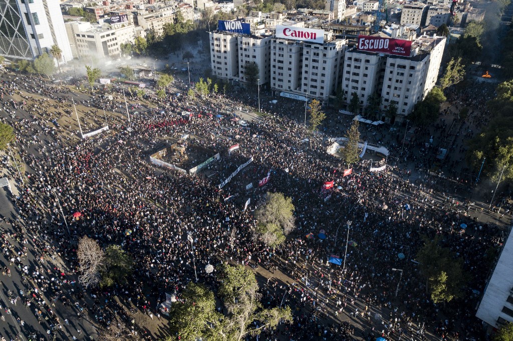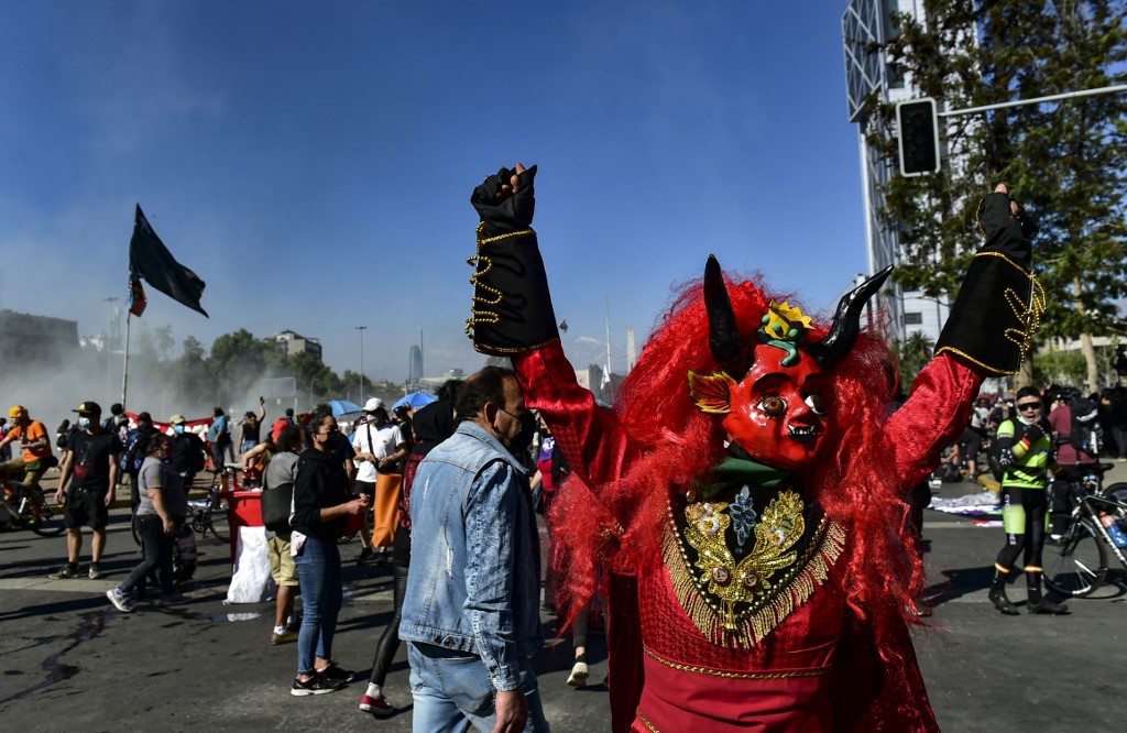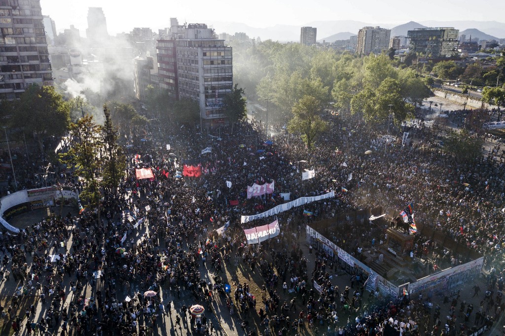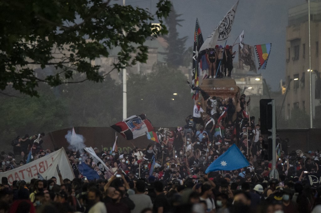 En Santiago, la policía calculó entre "8 mil a 10 mil personas" que caminaron la céntrica Plaza Italia, bautizada por los manifestantes como "plaza Dignidad", epicentro del estallido social de octubre de 2019 que dejó más de 30 muertos.