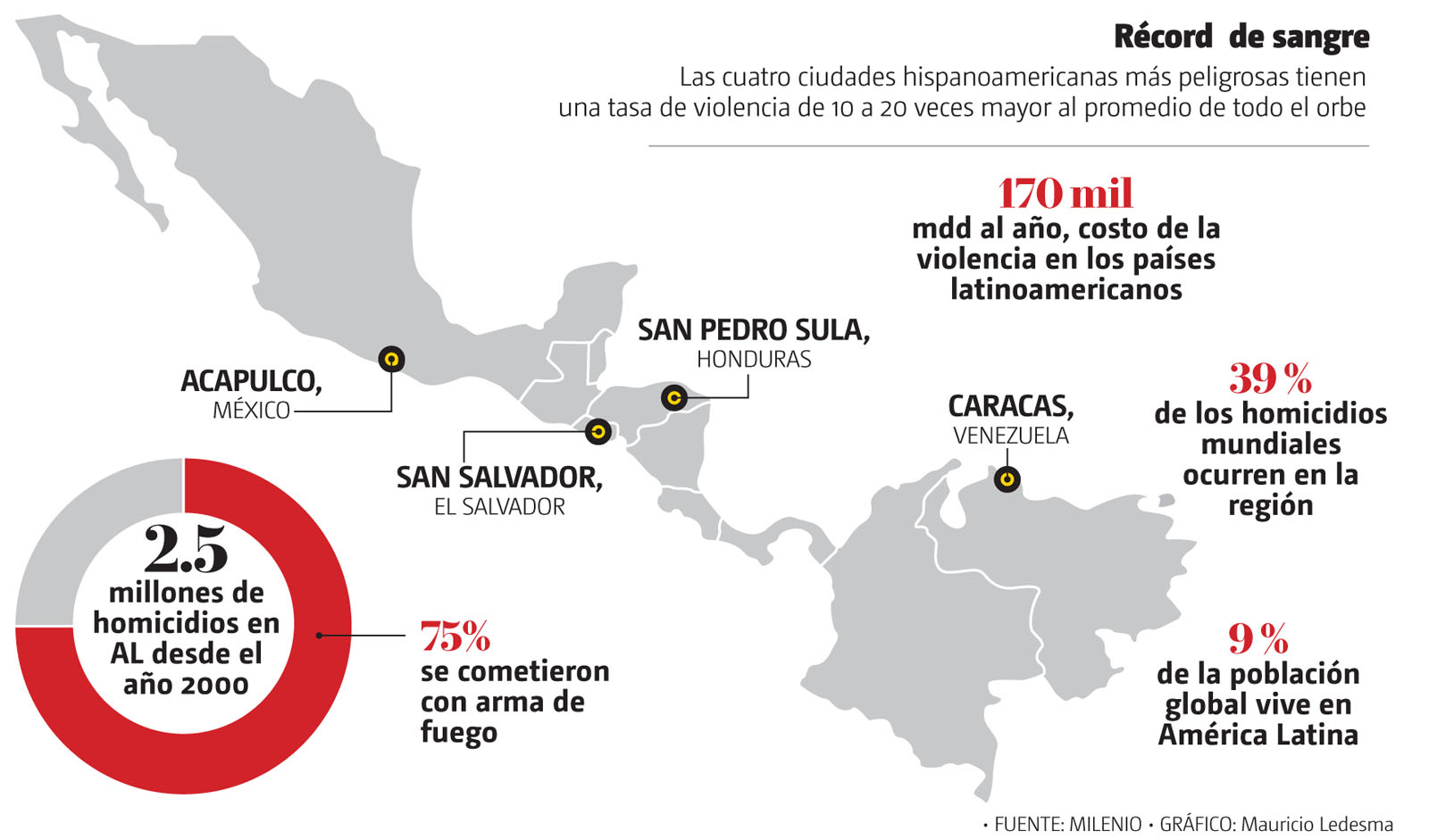 Con el nueve por ciento de la población mundial, la región es la única del mundo donde la principal causa externa de muerte es el homicidio (52 por ciento de los fallecimientos).