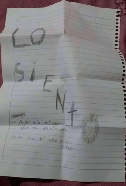 Junto al cuerpo del menor también fue encontrada una nota escrita a mano en una hoja: “Lo siento, su hijo vio algo que no debía ver. Tenemos al otro hijo mayor”.