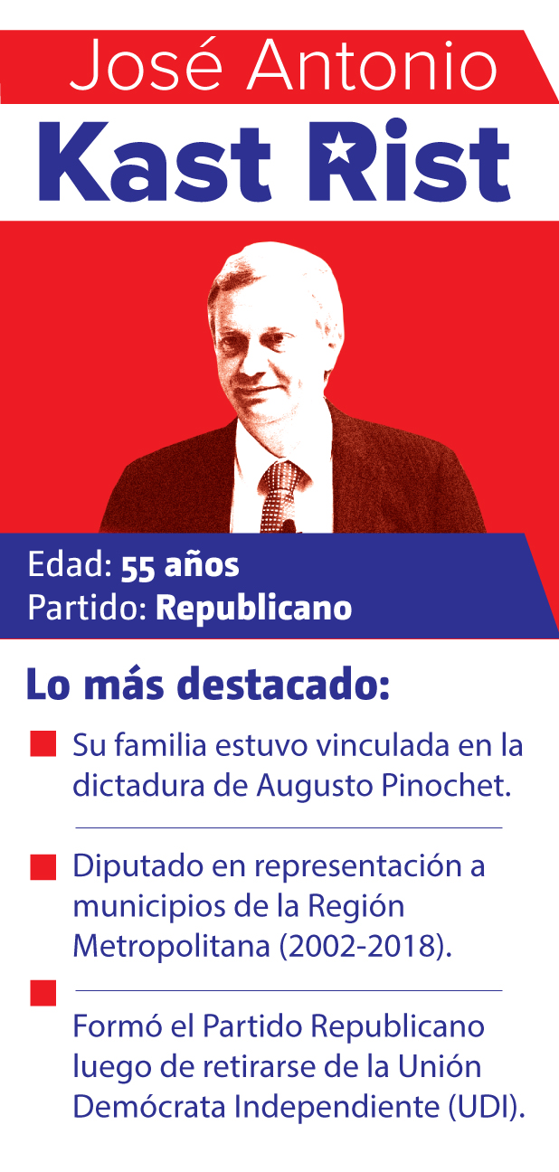 Admirador y defensor de la dictadura de Augusto Pinochet, que compagina ideológicamente con líderes como Donald Trump, Jair Bolsonaro, además de ser afín a los pensamientos del partido español Vox, de Santiago Abascal, y del recién diputado electo en Argentina, Javier Milei, el ultraderechista se presenta como el candidato para reestablecer el orden en Chile tras el estallido social de 2019, la crisis migratoria y el conflicto mapuche.