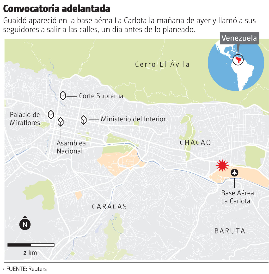 Aunque la rebelión alentada por la oposición no ha logrado quebrar el respaldo del alto mando militar a Maduro, Guaidó subrayó que evidenció fracturas.