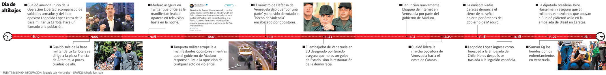 “Mañana (hoy) primero de mayo continuamos (...). A lo largo y ancho de Venezuela, estaremos en las calles”, agregó ratificando sus convocatorias a ir a protestas el jefe del Parlamento, reconocido como presidente interino por medio centenar de países, encabezados por EU.