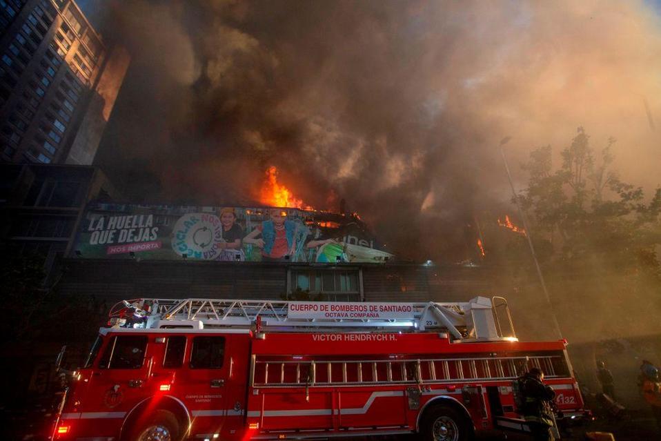El centro comercial fue saqueado primero y posteriormente comenzó a arder en su interior, y con el paso de las horas una gran columna de humo iba oscureciendo el cielo de la capital de Chile mientras el fuego se propagaba a los edificios colindantes.