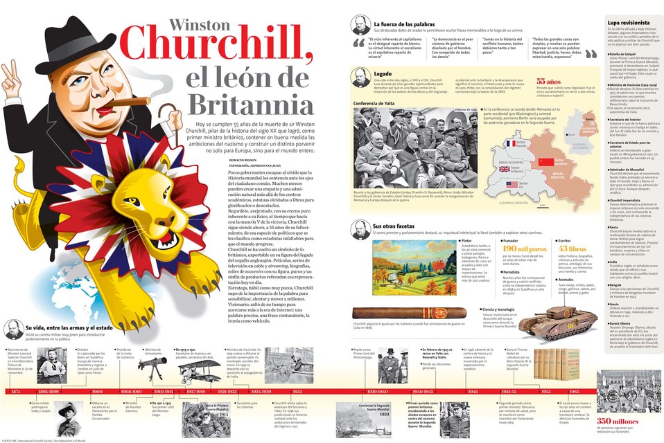 Regordete, avejentado, con su eterno puro inherente a su físico, al tiempo que hacía con la mano la V de la victoria, Churchill sigue siendo ahora, a 55 años de su fallecimiento, de esa especie de políticos que se les clasifica como estadistas infaltables para que el mundo progrese.