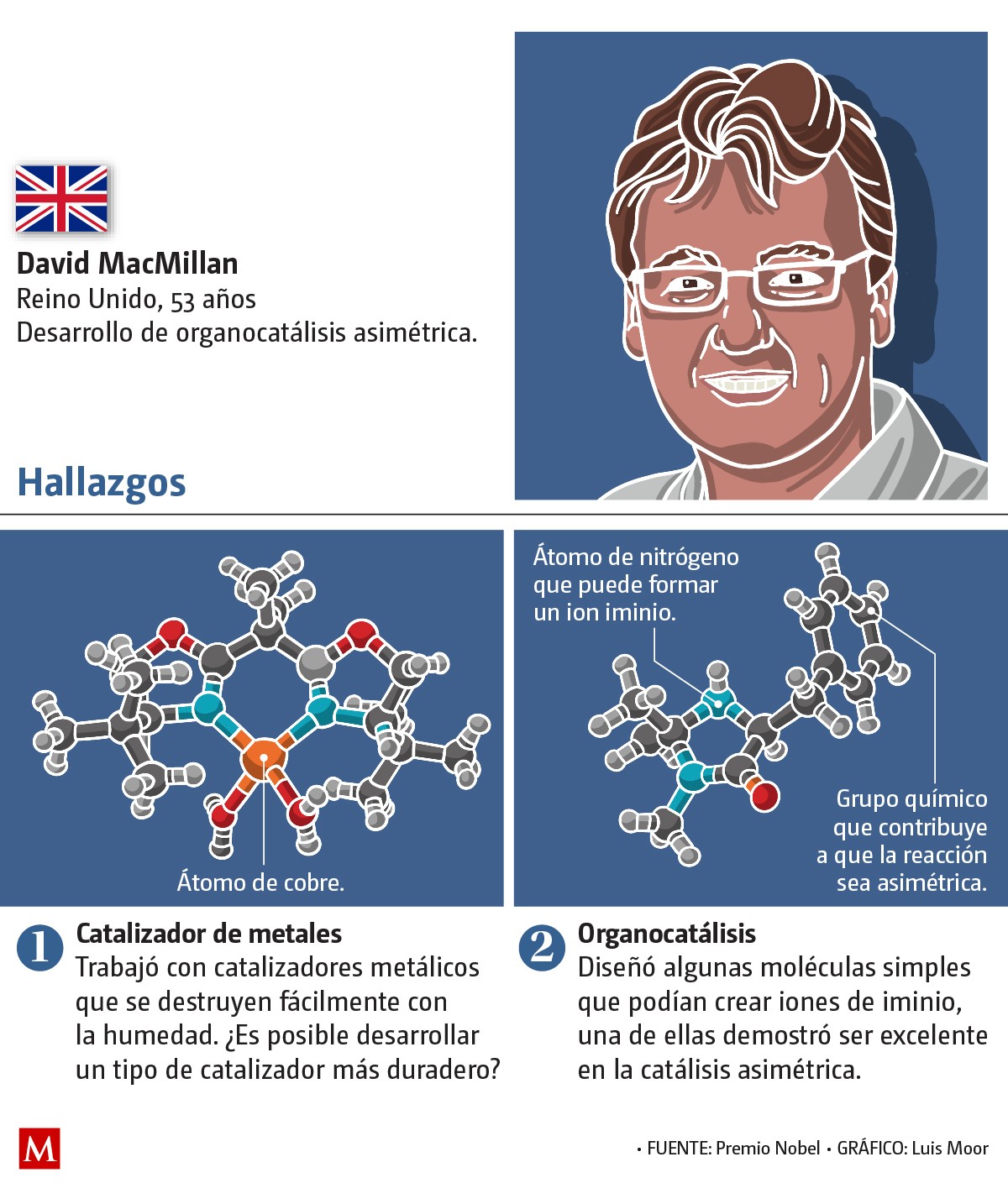 MacMillan (Bellshill, Reino Unido, 1968) por su parte, trabajó con catalizadores metálicos que se destruían fácilmente con la humedad. Se preguntó si podría desarrollar un tipo de catalizador más duradero utilizando moléculas orgánicas simples. "Uno de estos demostró ser excelente en catálisis asimétrica".