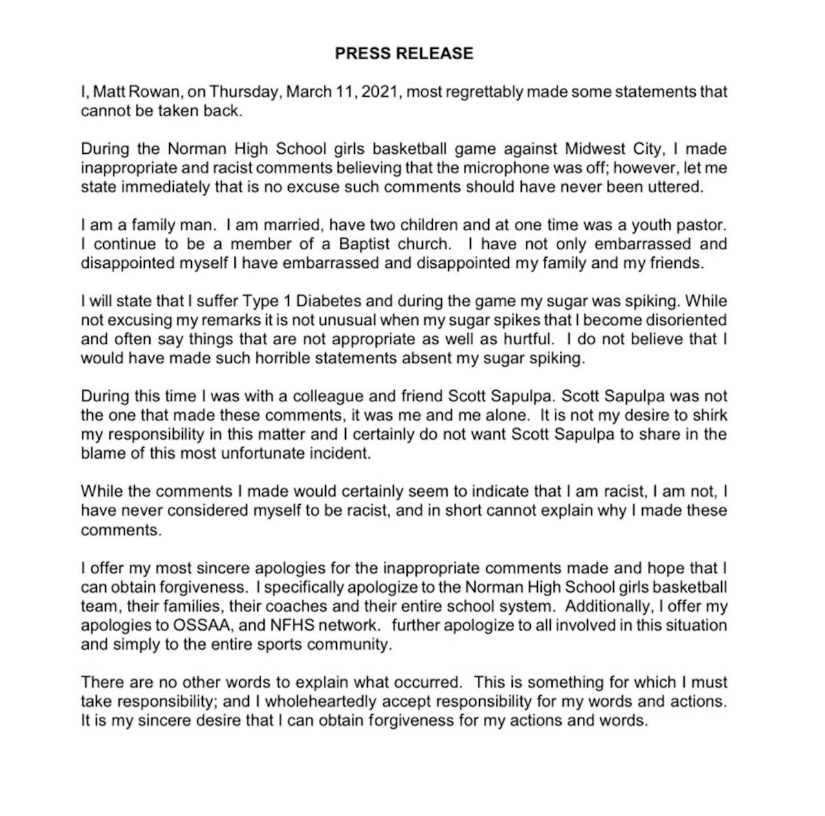 Las jugadoras de la escuela Norman High realizaron un acto de protesta y apoyo al movimiento Black Lives Matter previo al partido de cuartos de final contra Midwest City, en la preparatoria de Sapulpa. Sin embargo, Rowan comenzó a lanzar quejas e insultos a las jóvenes sin percatarse que su micrófono estaba encendido.