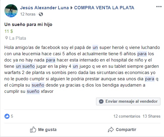 El padre de Tahiel comentó en una publicación de compra y venta en Facebook que su hijo tiene el sueño de jugar en la Play 4 un juego que ve en su tablet, pero dadas las circunstancias económicas, Alexander no se lo puede cumplir.