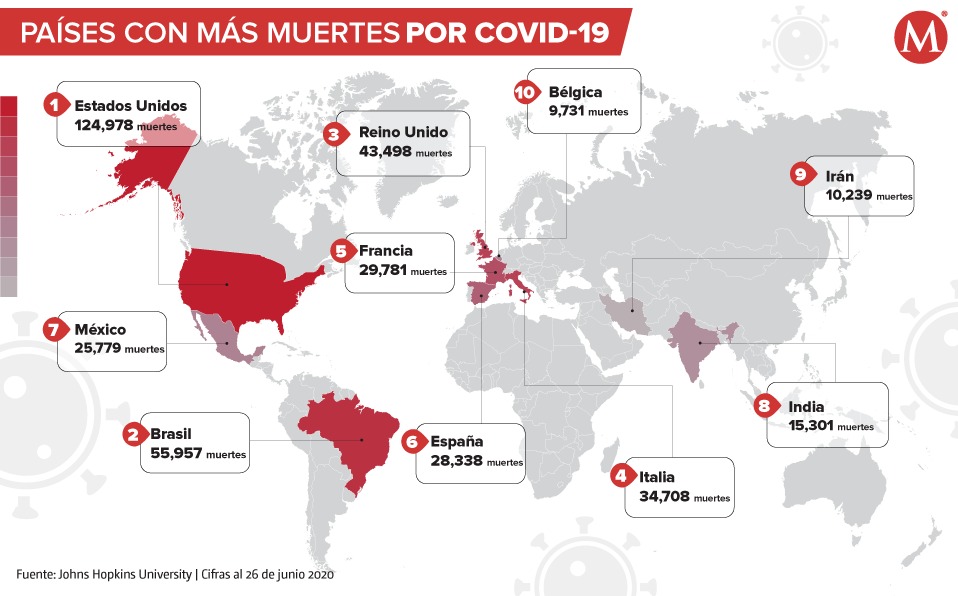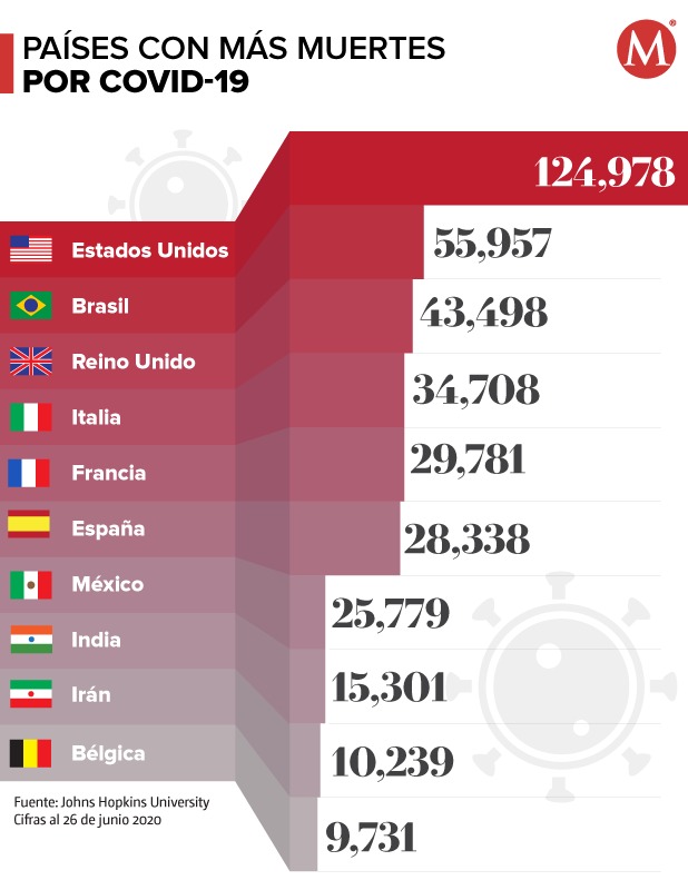 Las muertes en México llegaron a 25 mil 779 este 26 de junio, consolidándose desde hace unas semanas como en el séptimo país con más decesos en el mundo. Está a 2 mil 559 muertes de superar a España y escalar una posición, de acuerdo con los datos de la Universidad Johns Hopkins.