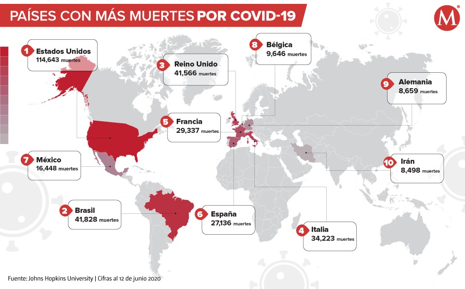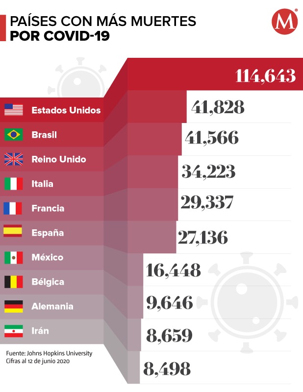Reino Unido, Italia, Francia, España, Bélgica y Alemania se mantienen entre los diez países con más muertes por coronavirus en el mundo. La lista es encabezada por Estados Unidos, que registra más de 114 mil fallecimientos.