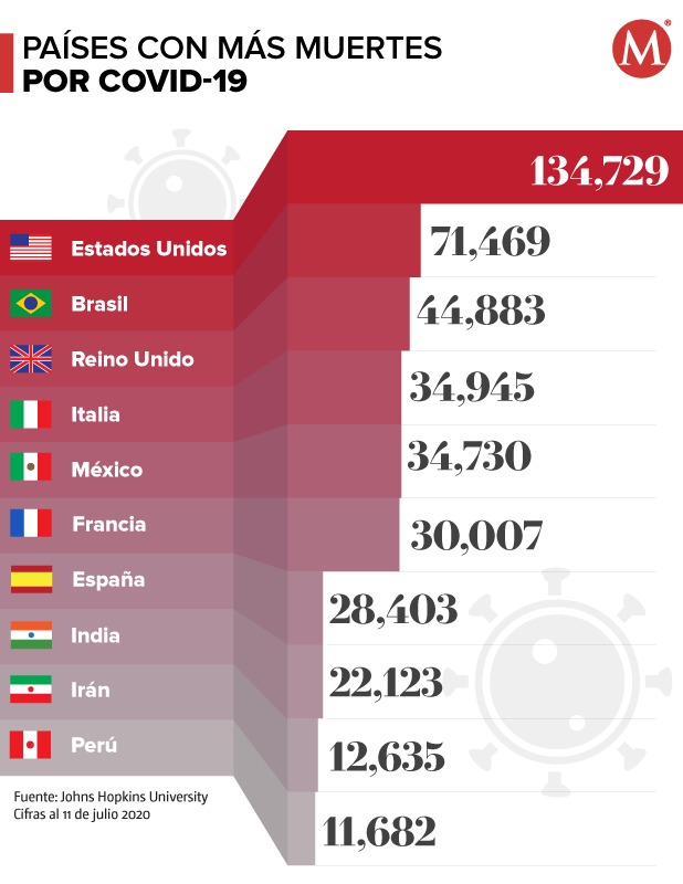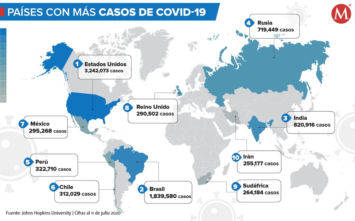 Durante la segunda semana de julio, aumentaron cerca de 35 mil muertos por el virus y se confirmaron más de 1.3 millones de nuevos casos. India se consolidó como el tercer país con más casos, mientras que México está cerca de superar en decesos a Italia.
