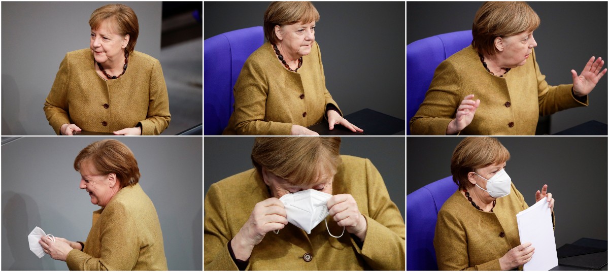Este hecho generó rápidamente risas entre los asistentes y en la propia Merkel, quien se colocó el cubrebocas y se dirigió nuevamente a su asiento para escuchar las demás intervenciones.