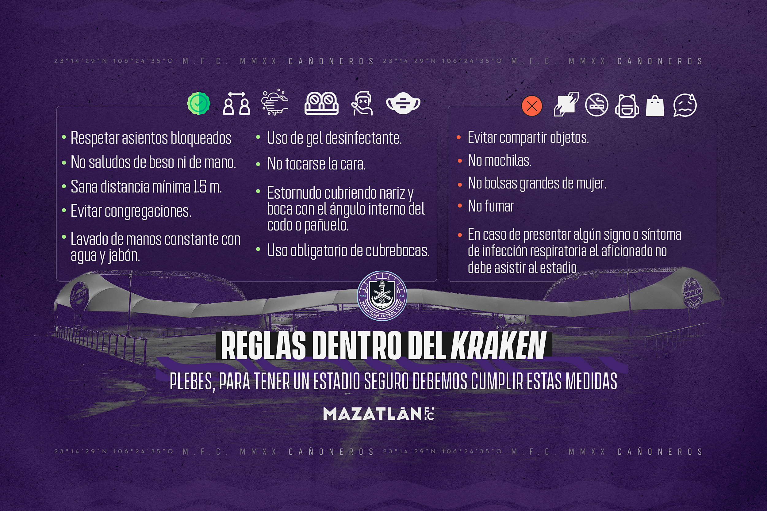 Otras de las normas de seguridad que puso Mazatlán FC para evitar contagios de covid-19 en su estadio, será que no se aceptarán más de dos personas juntas, el estacionamiento permanecerá cerrado, los boletos se venderán únicamente en línea y no se dará acceso a menores de 12 años.