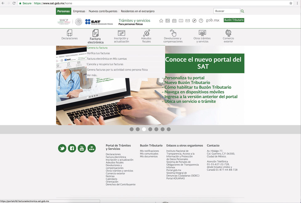 • Para generarlo, debes ingresar al portal www.sat.gob.mx, seleccionar la opción “factura electrónica” y luego “genera tu factura”.