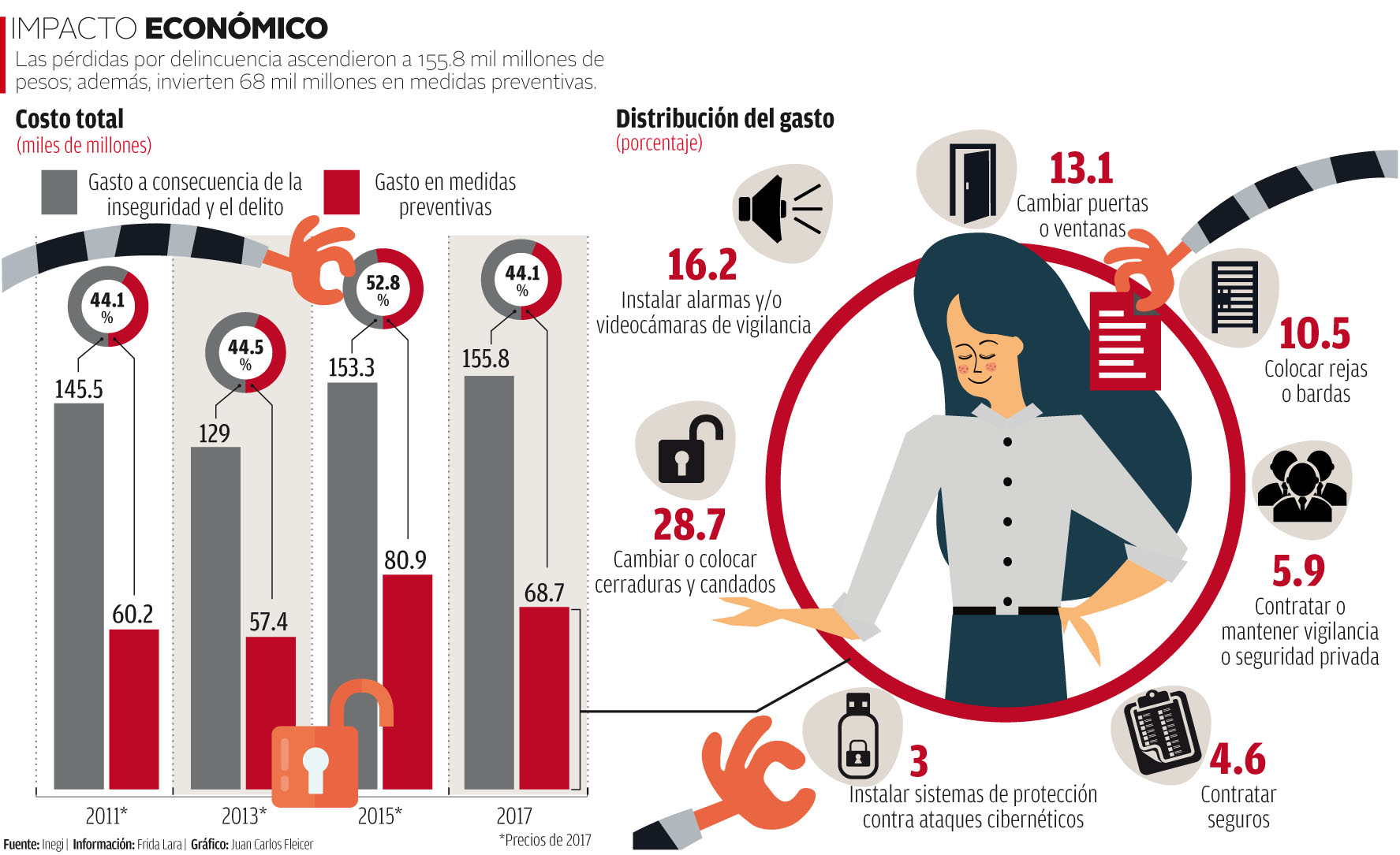 En tanto, las empresas señalaron que para combatir la delincuencia invirtieron 68.7 mil millones de pesos, de los cuales, 44.1 por ciento se destinó a medidas preventivas como cambiar o colocar cerraduras, instalar alarmas, reforzar puertas o ventanas y colocar rejas, entre otras medidas.