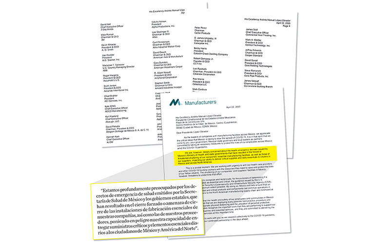 Las 327 empresas de manufactura firmantes, entre las que se encuentran proveedores de equipo médico, señalaron en la misiva: "Estamos profundamente preocupados por los decretos de emergencia de salud emitidos por la Secretaría de Salud de México y los gobiernos estatales, que han resultado en el cierre forzado o en amenaza para las instalaciones de fabricación esenciales de nuestras compañías, así como las de nuestros proveedores, poniendo en peligro nuestra capacidad de entregar suministros críticos y elementos esenciales diarios a los ciudadanos de México y América del Norte".