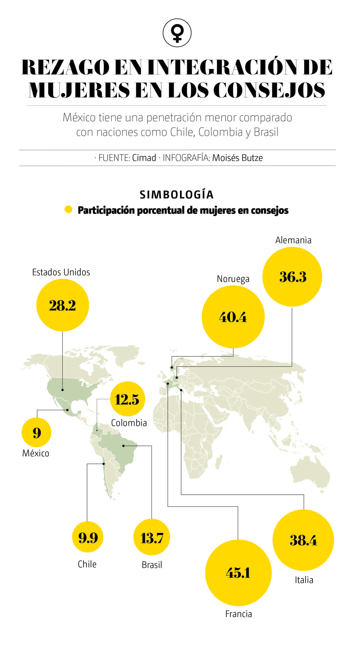 Los países con mayor diversidad de género sus consejos se encuentran en Europa: en primer lugar se encuentra Francia con 45.1 por ciento; Noruega con 40 por ciento; mientras Italia se ubica en 38.4 por ciento.