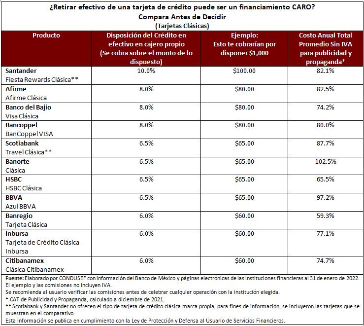 Para disposición del crédito en efectivo en cajero propio, Santander cobra la comisión más alta, con 10 por ciento; y Citibanamex, la más baja, con 6 por ciento.