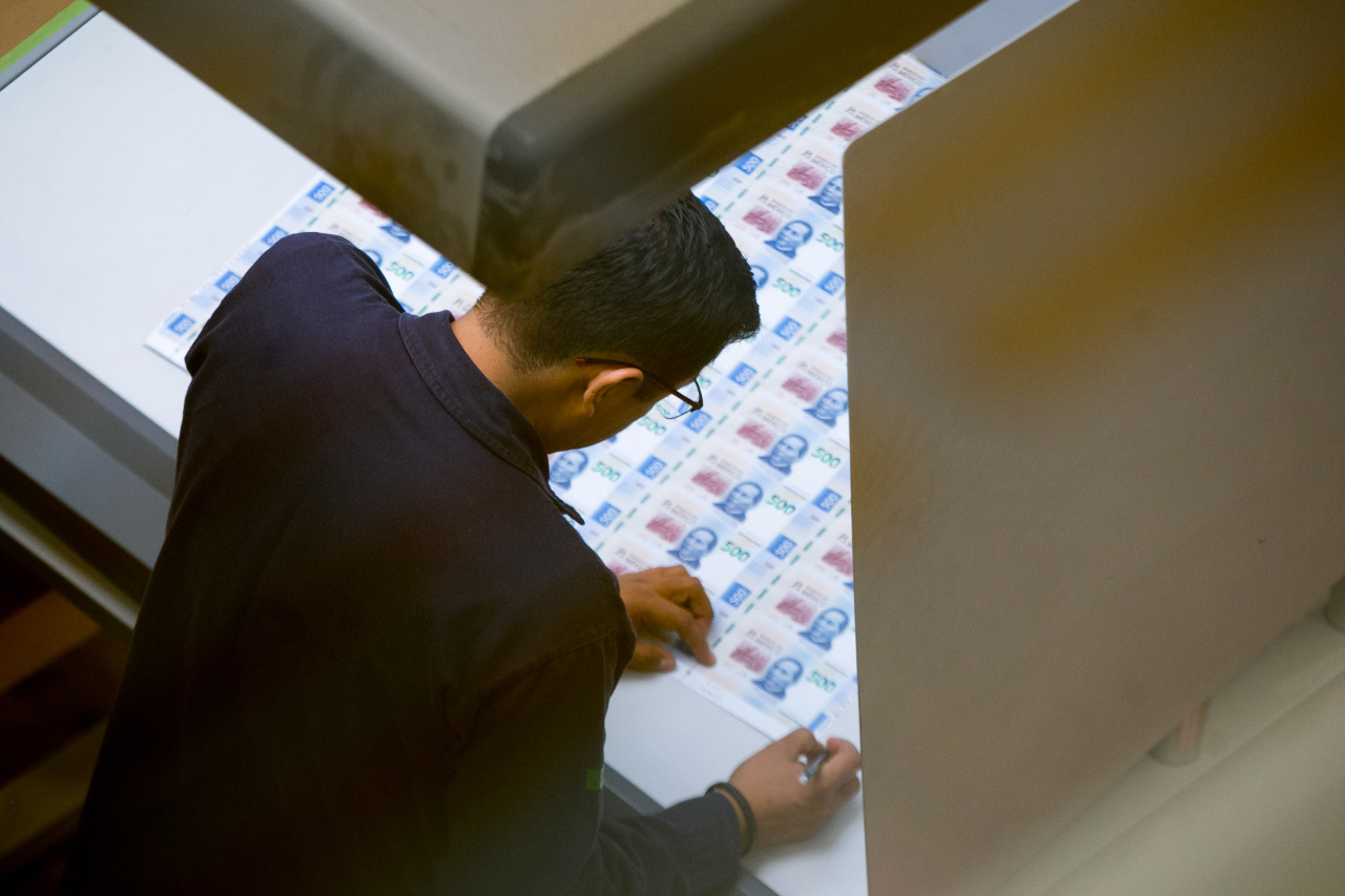 En el proceso final de elaboración de un billete tiene un toque humano, después de pasar por máquinas que validen todos los esquemas de seguridad y calidad, hay personas que los revisan para detectar algo que las máquinas no hayan hecho.
