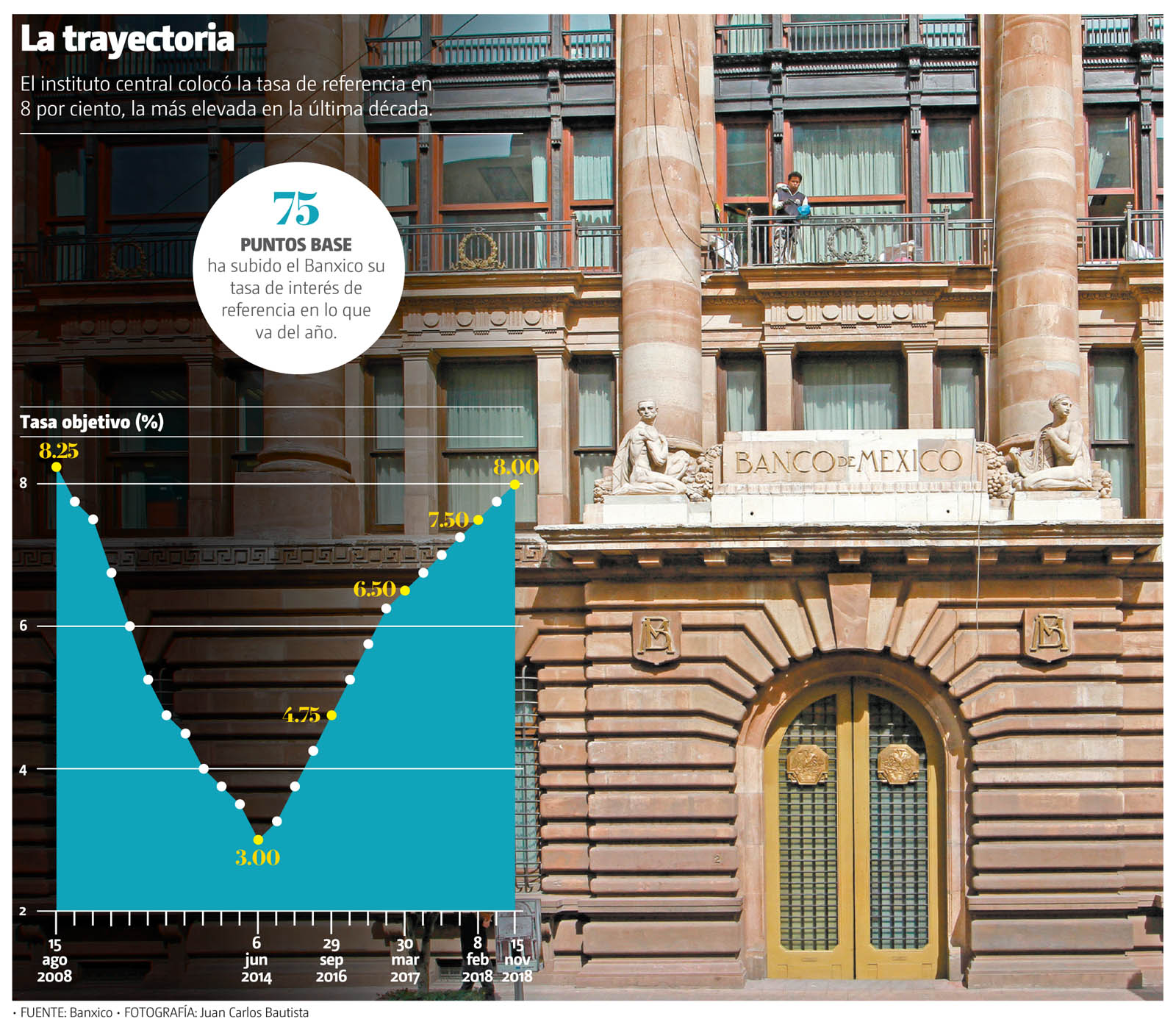 En su anuncio de política monetaria, Banxico informó que su Junta de Gobierno decidió elevar la tasa de interés de referencia de 7.75 a 8 por ciento —la más alta de la última década—, y agregó que la depreciación del tipo de cambio ha estado ligada, entre otras cosas, al anuncio de la intención de cancelar el Nuevo Aeropuerto Internacional de México.