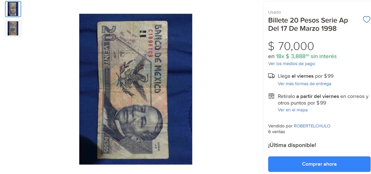 En plataformas de internet, como Mercado Libre, una pieza de la familia D del Banxico emitida en 1998, se oferta hasta en 70 mil pesos por estar hecho de papel de algodón y no de plástico como las familias de billetes posteriores.