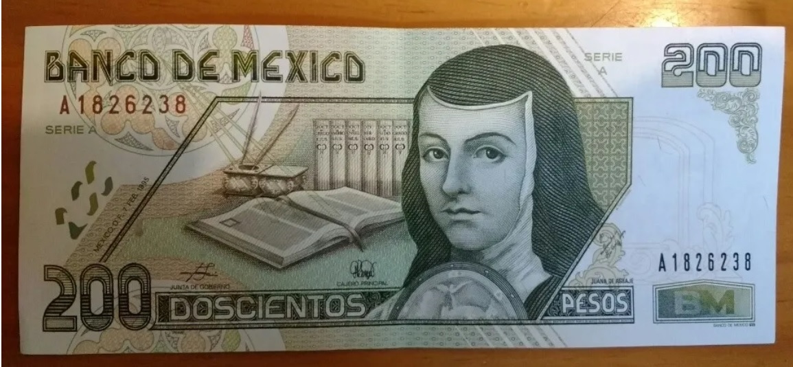 El billete de 200 pesos donde aparece la escritora Sor Juana Inés de la Cruz fue distribuido por el Banco de México (Banxico) por primera vez en 1994, como parte de la familia C de billetes. Actualmente puede encontrarse en plataformas de comercio electrónico por hasta 2 mil pesos.