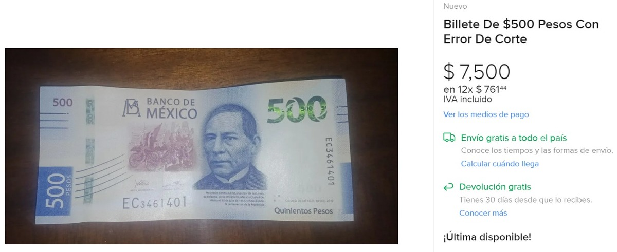 Dicho billete se oferta en la plataforma de comercio electrónico Mercado Libre en 7 mil 500 pesos, 15 veces su valor real, ya que el vendedor asegura que la pieza tiene un error de corte.