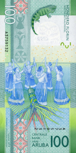 El diseño del billete de 100 florines de Aruba en verde esmeralda presenta una iguana en el anverso y mujeres bailando con cintas en el reverso verde y azul. El billete es más largo que uno de 20 euros y un poco más ancho, pero más corto que los billetes estadunidenses.