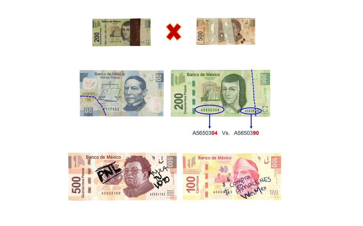 De acuerdo con el Banco de México (Banxico), si un billete está sucio, despintado, descolorado, con sellos, anotaciones, manchado de grasa, aceita, pintura, tinta, sangre, conserva su valor.