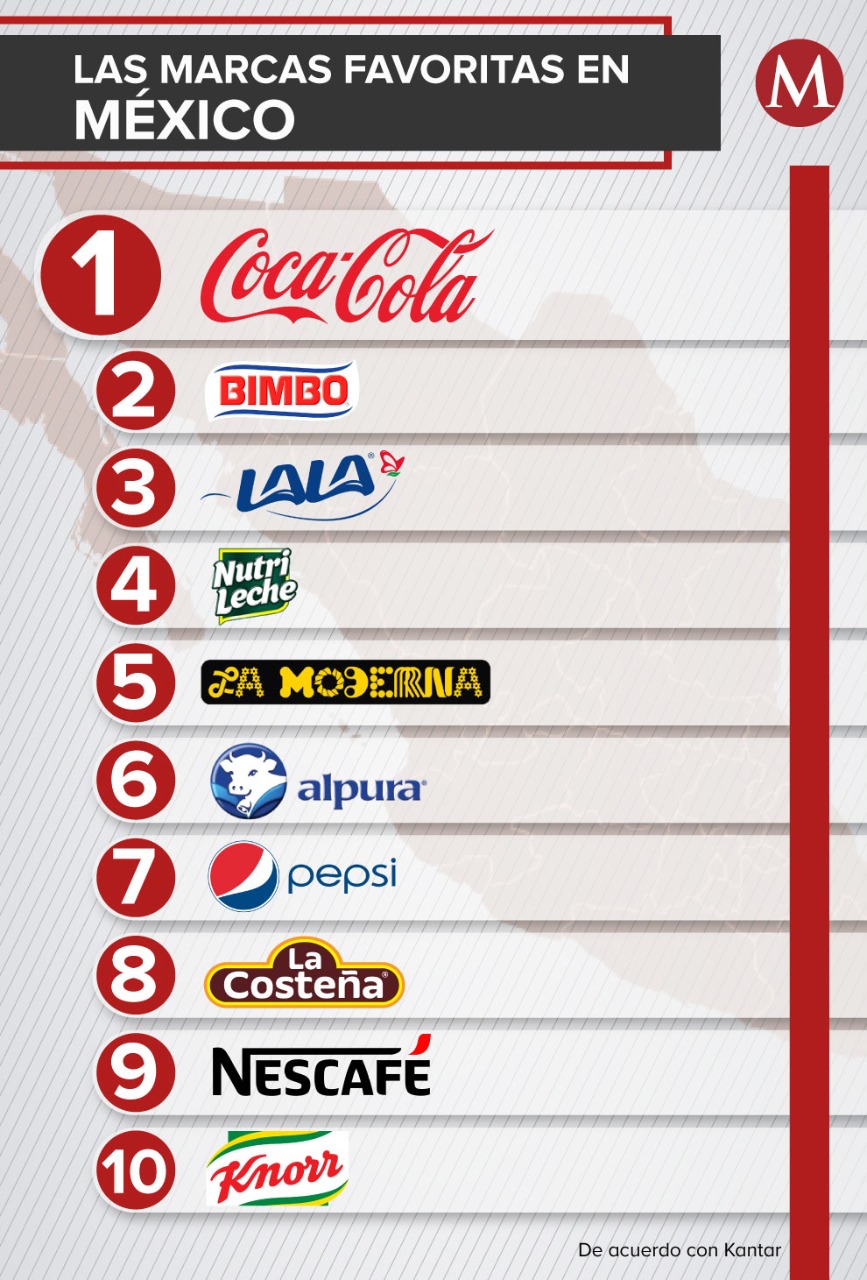 El ranking de las 10 marcas más elegidas por los mexicanos se mantuvo prácticamente sin cambios, respecto a la edición del año pasado. Sin embargo, Pepsi pasó de la novena a la séptima posición, en tanto, La Costeña bajó un peldaño.