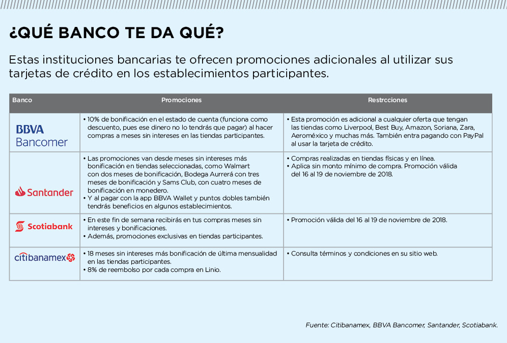 Durante este fin de semana, la fiebre de las compras por hace que los centros comerciales luzcan a reventar, como si estuvieran regalando los productos. Según datos de la consultoría de Gabinete de Comunicación Estratégica (GCE), 7 de cada 10 mexicanos buscan descuentos o promociones a meses sin intereses. En esta octava edición, que se realiza del 16 al 19 de noviembre, los establecimientos ofrecerán promociones como meses sin intereses en tiendas participantes, puntos extra o dobles en tarjetas de crédito, bonificación en las mensualidades o porcentajes de la compras en monederos electrónicos.