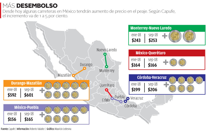 Caminos y Puentes Federales (Capufe) informó que en la vía México-Puebla se dio uno de los mayores aumentos, al registrar una alza de 5.7 por ciento, con lo cual se estarán pagando 165 pesos.