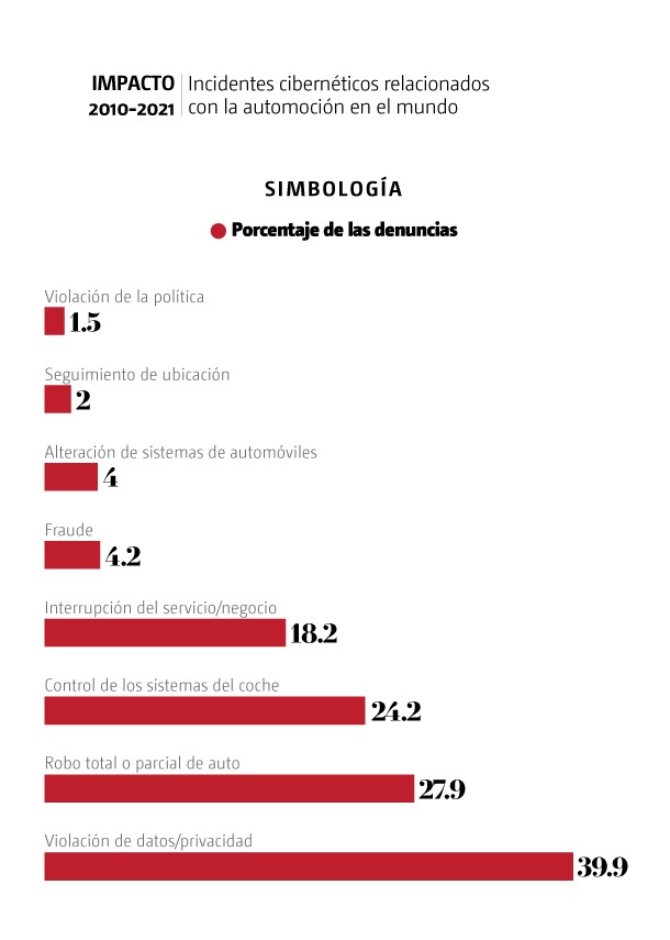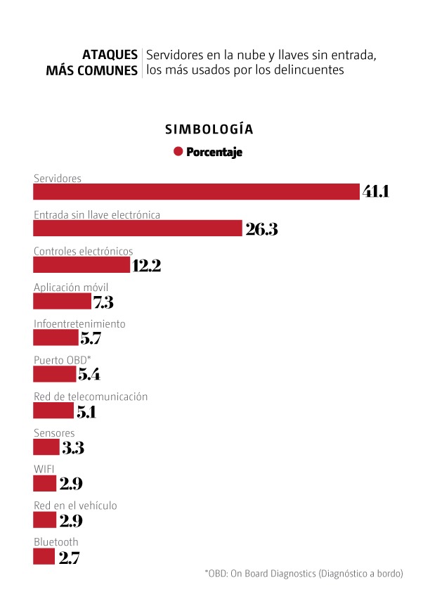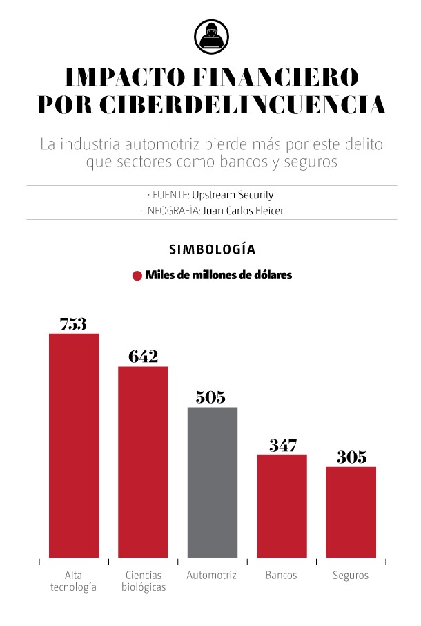 Cifras de la plataforma de ciberseguridad Upstream muestran que en 2021 a escala mundial se reportó un impacto financiero de 505 mil millones de dólares en la industria automotriz por el car hacking, superando las pérdidas que reportaron sectores como bancos y seguros por ciberdelincuentes, que son 347 mil y 305 mil millones de dólares, respectivamente.