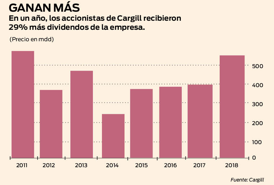 Cargill es la compañía privada estadounidense más grande por ingresos y desempeña un papel central en el suministro mundial de alimentos, nueve millones de toneladas de materias primas agrícolas en todo el mundo. Alrededor de 90% de sus acciones ordinarias son propiedad de los miembros de las familias Cargill y MacMillan, descendientes del hombre que fundó la compañía en 1865.