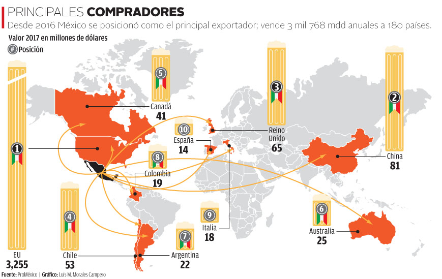Datos de la Secretaría de Economía revelan que en 2016 México se colocó en el primer lugar a escala mundial en exportación de cerveza; asimismo, ocupó el cuarto sitio como productor, solo por detrás de China, Estados Unidos y Brasil.
