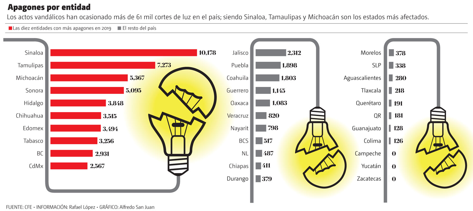 En la lista de las que tienen incidencia de vandalismo de instalaciones eléctricas también se encuentran Hidalgo (3 mil 848), Chihuahua (3 mil 515), Estado de México (3 mil 494), Tabasco (3 mil 256) y Baja California (2 mil 931).