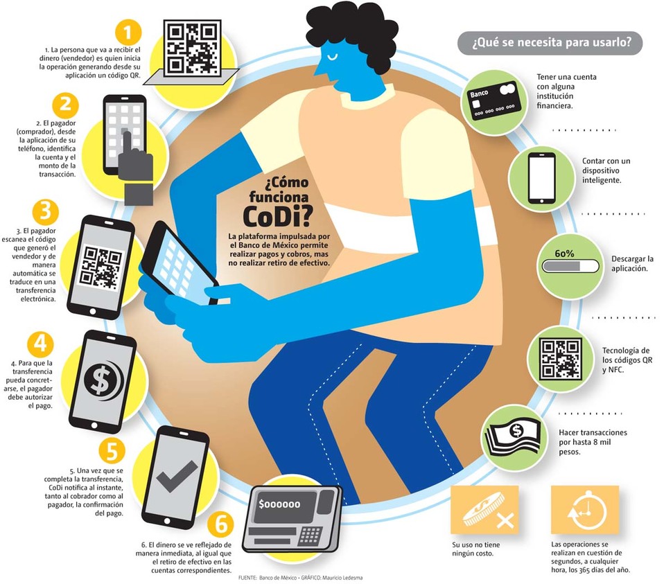 El CoDi es una plataforma para realizar cobros y pagos de manera inmediata a través del Sistema de Pagos Electrónicos Interbancarios (SPEI), en la que se pueden realizar transferencias de hasta 8 mil pesos sin ninguna comisión.