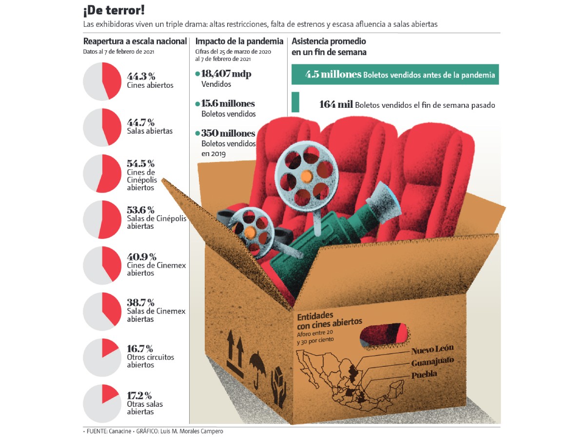 Según la Cámara Nacional de la Industria Cinematográfica (Canacine) en 2020 los ingresos de las salas bajaron 80 por ciento. Por ahora han reabierto 44.7 por ciento de las salas, con baja afluencia.