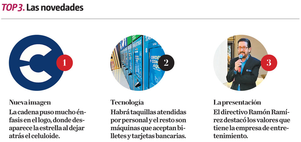 La transformación es completa, incluso, el logotipo ha sufrido una actualización, que para el director de Marketing, Ángel Villanueva, es un paso muy importante. “Tenemos un nuevo logotipo con la C, con el que hemos jugado más. Detectamos que mientras entrábamos a países donde no había conocimiento previo, la marca se percibía de una manera diferente a México”. Villanueva agregó que en nuestro país el logo irá cambiando, dependiendo de las fechas que se acerquen y las películas.