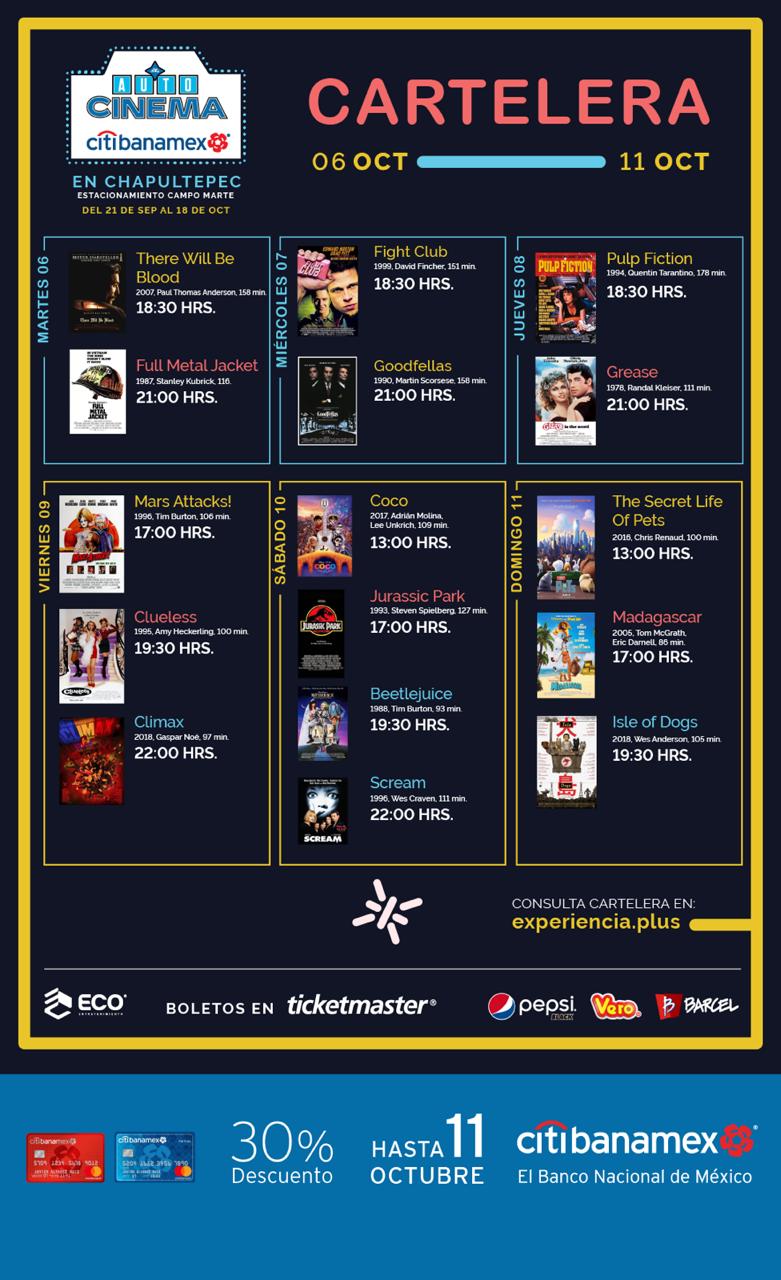 Inspirados en la tendencia pop up, o itinerante, e impulsado por la actual contingencia y la nueva normalidad, Citibanamex inauguró el pasado 21 de septiembre su autocinema ubicado en el corazón del Bosque de Chapultepec, en el estacionamiento de Campo Marte, y el cual estará abierto al público hasta el 18 de octubre.