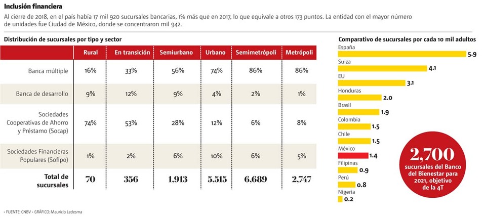 El Banco del Bienestar sustituye al Banco del Ahorro Nacional y Servicios Financieros (Bansefi). El plan de expansión de esta institución, dirigida por Rabindranath Salazar Solorio, contempla llegar en 2021 a 2 mil 700 sucursales y lograr 13 mil sucursales para el final del sexenio.