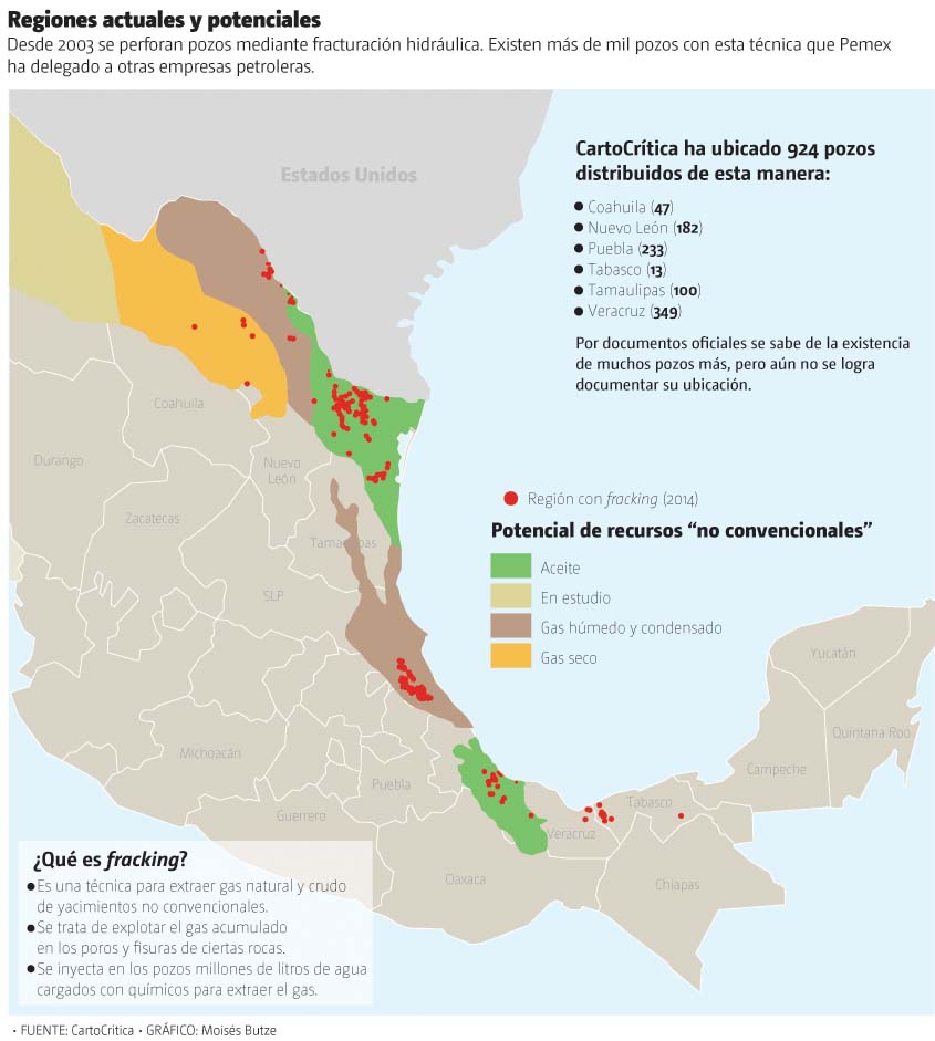 Esta técnica ha sido utilizada en México desde 1960 y, de acuerdo con una investigación de CartoCrítica, la dimensión del fracking en México alcanza 7 mil 879 pozos con un total de 36 mil 159 fracturas.