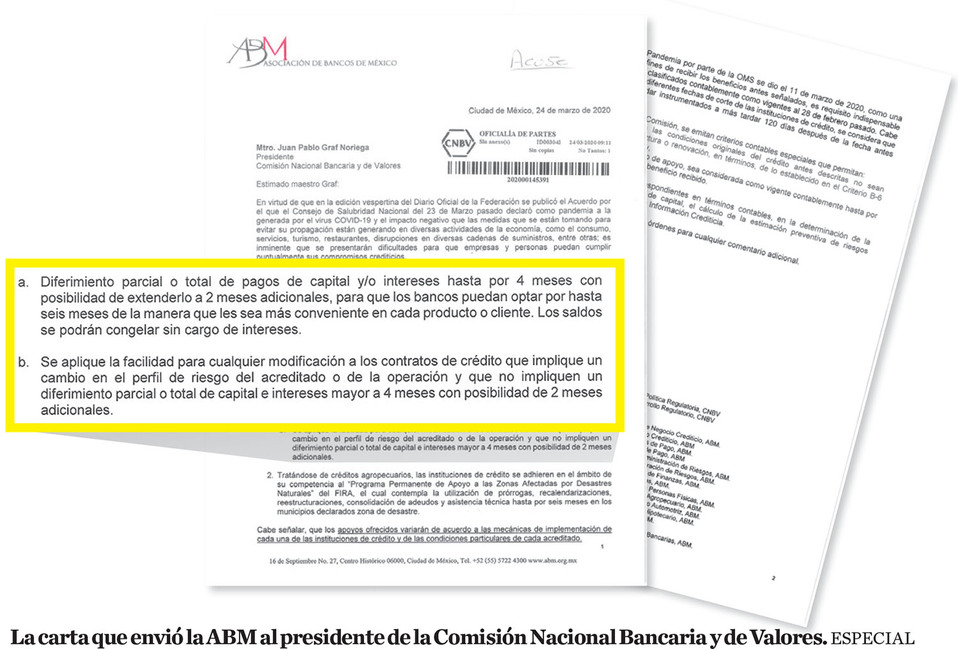 Los bancos que operan en México se anticiparon al impacto económico que tendrá la pandemia del coronavirus, por lo que la Asociación de Bancos de México (ABM) alista una serie de medidas en apoyo a sus clientes. En un documento enviado al presidente de la Comisión Nacional Bancaria y de Valores, Juan Pablo Graf Noriega, la ABM señala que entre las medidas se encuentra diferir de entre dos hasta cuatro meses el pago de los créditos que algunos clientes se vean imposibilitados de realizar.